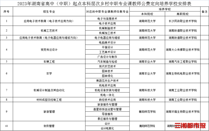 三湘都市报5月24日讯(全媒体记者 杨斯涵 黄京)近日,湖南省教育厅发布通知,为切实加强我省乡村学校、幼儿园、特殊教育教师队伍建设,2023年,我省按照“自愿报名、择优录取、公费培养、定向定期服务”的原则,继续实施初中起点乡村教师和高中(中职)起点本科层次各类乡村教师公费定向培养工作。